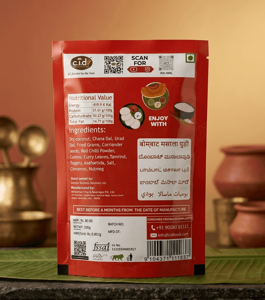 Bombat Masala Pudi is the one spice mix your idli, dosa and rice have always been waiting for! Blended with real spices and wholesome ingredients, it adds a rich and bold South Indian flavor to every meal. Simply mix with ghee or oil and enjoy a delicious, nutritious dish the whole family will love. Grab yours today!